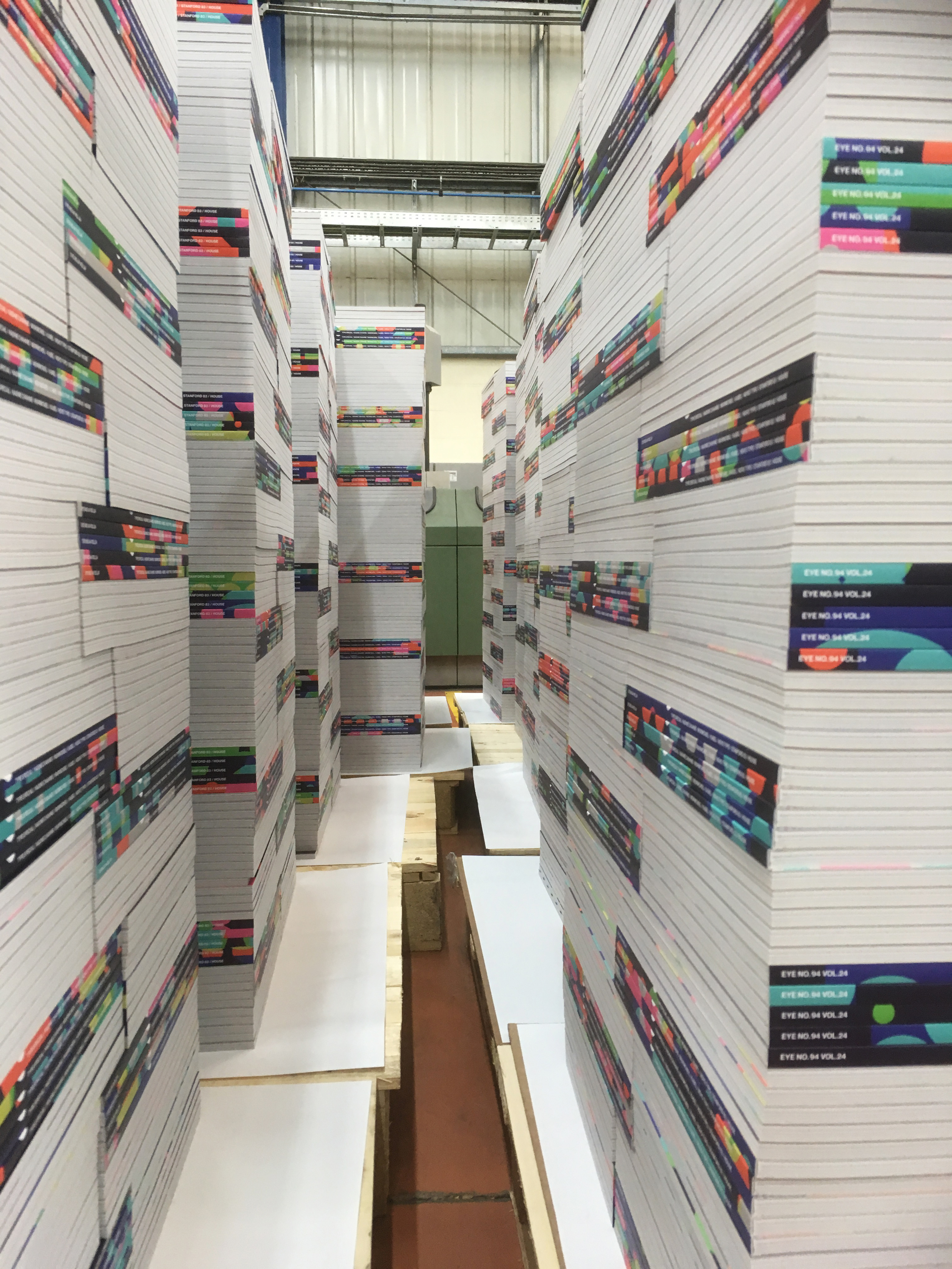 Bound and trimmed stacks of Eye 94 at Pureprint, prior to worldwide distribution.