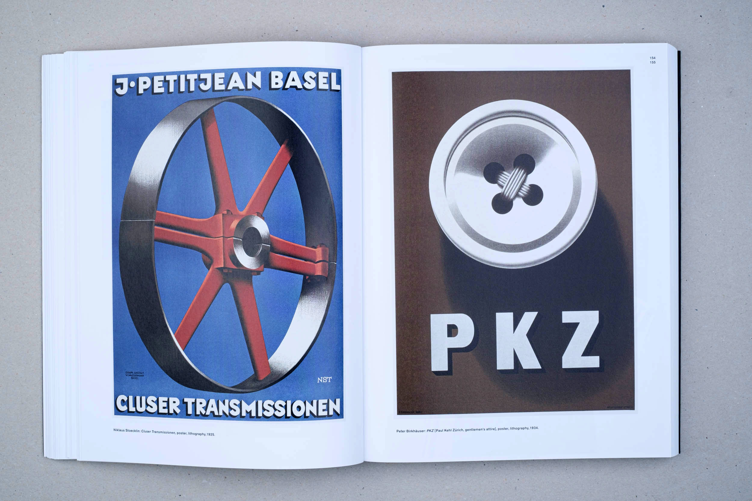 Spreads from The Birth of a Style showing posters by Niklaus Stoecklin, Peter Birkhäuser and Hermann Eidenbenz.