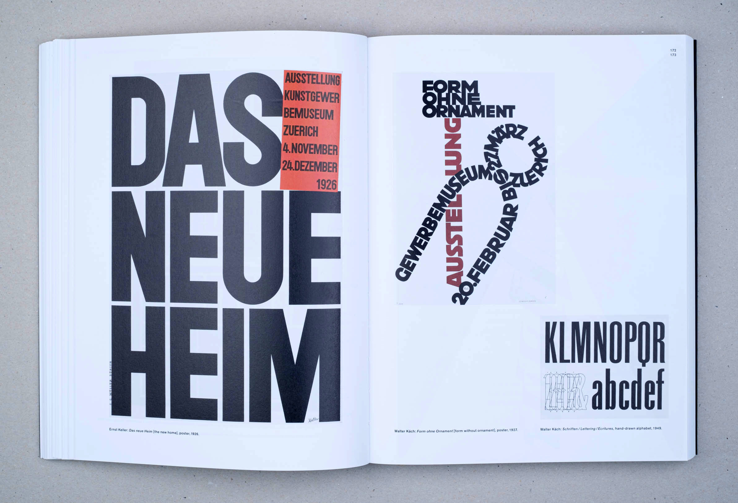 Right. Contents page. Top: Spread from The Birth of a Style featuring posters by Ernst Keller, 1926 and Walter Käch, 1927 and hand-drawn alphabet Schriften / Lettering / Ecritures by Walter Käch, 1949 (see article in Eye 92).