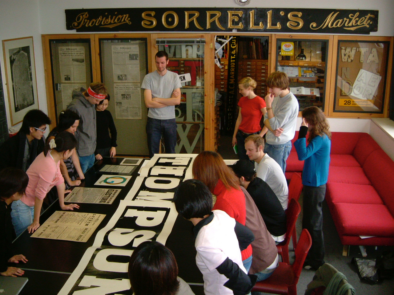 Snapshot of a Phil Baines tutorial with students (including Jack Schulze, later of Berg, back centre, see Eye 80 and James King, back right).