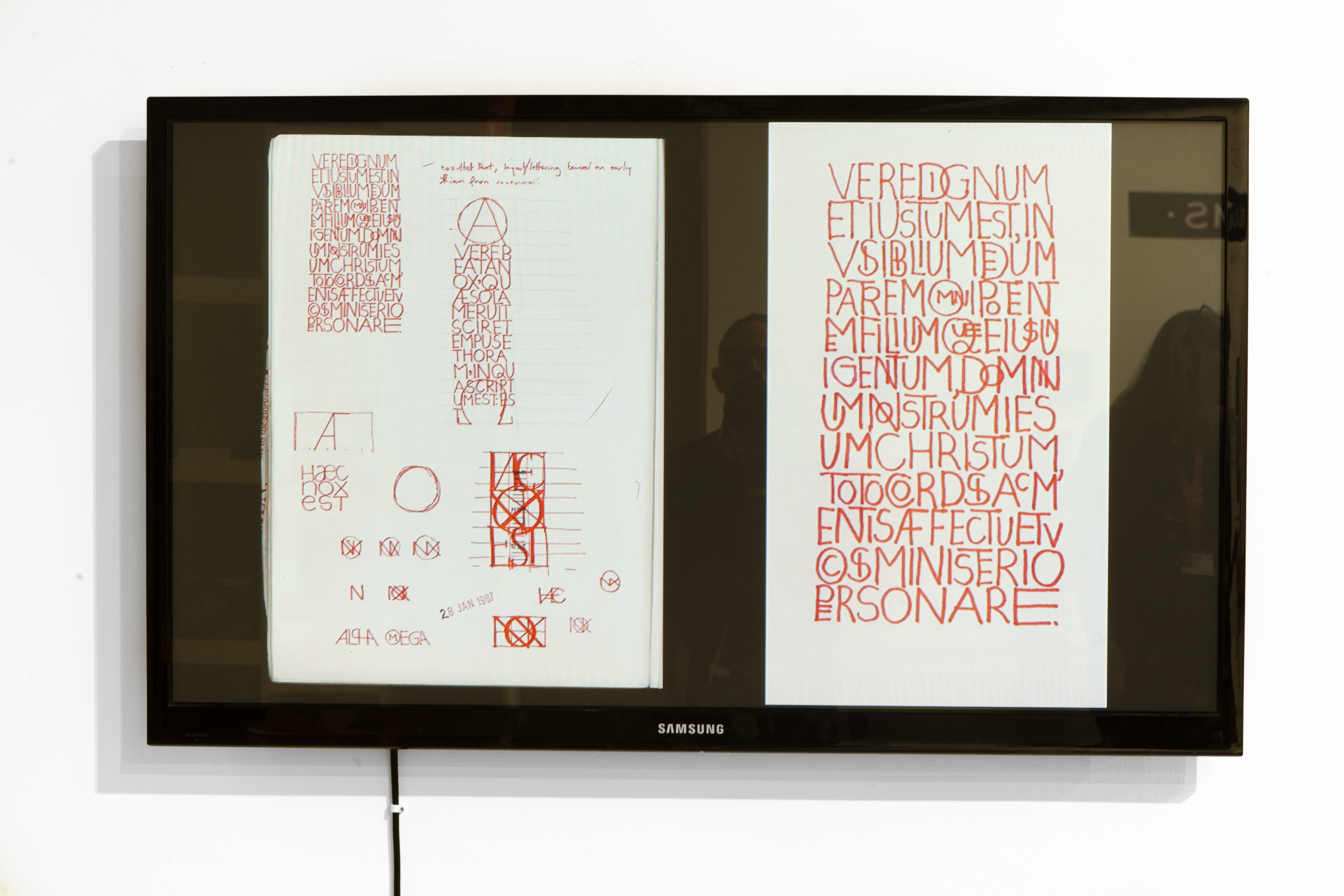 This exhibition shows an inspiring designer, teacher, historian, thinker of great flexibility. The work is laid out on the walls of the spacious Lethaby Gallery, and in a series of pine vitrines. Red banners divide it up into parts: ‘Book design’, ‘Collaborative practice’, ‘Drawing letters’, and so on.