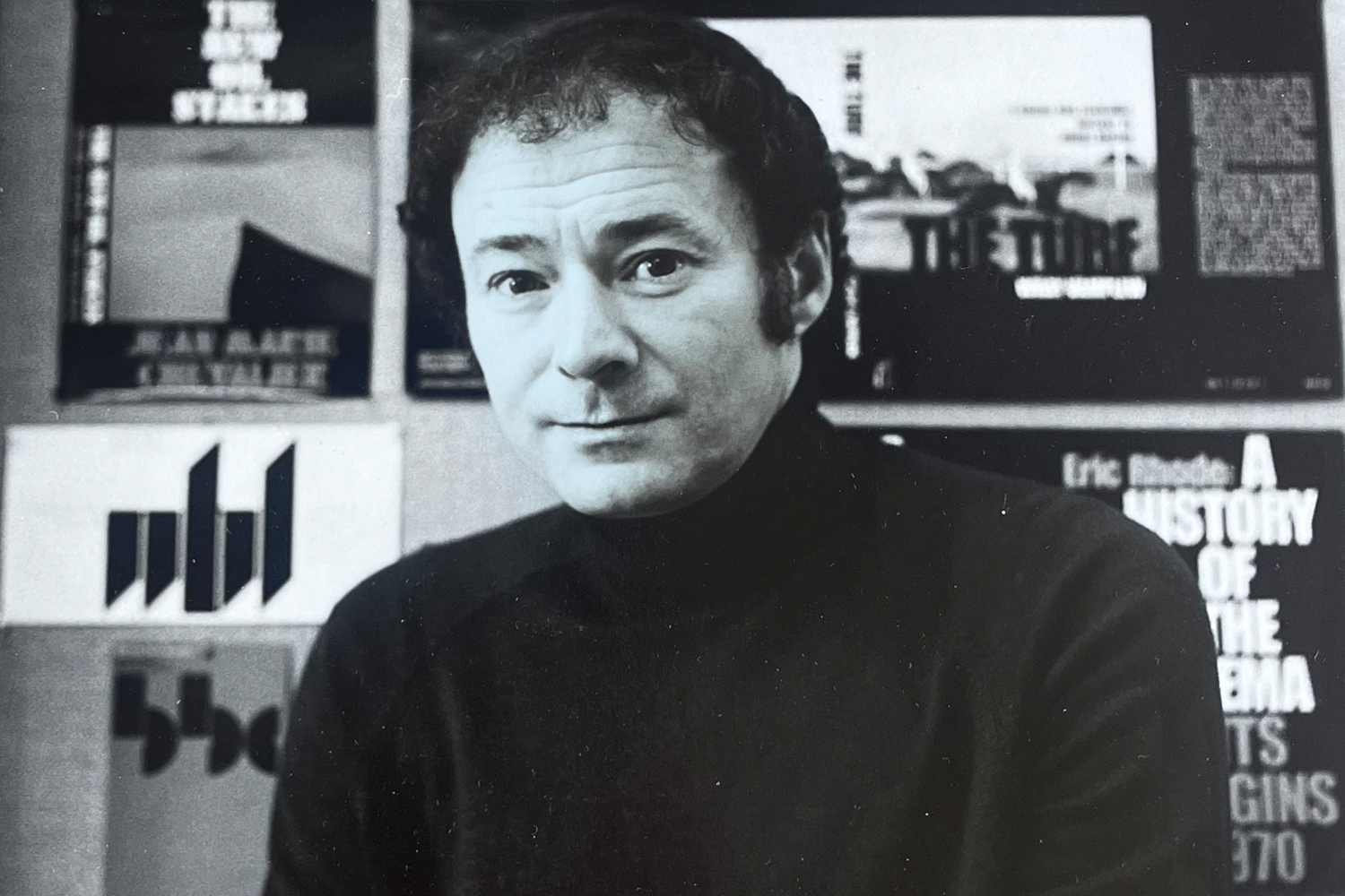 I left my desk with the cover design and walked towards him – nobody had introduced us – and here was I, a complete novice, approaching the chief designer for Penguin Books. He was clad in a black polo neck sweater, his face framed by dark sideburns speckled with grey, and although he had a swivel chair, he was actually standing behind this vast desk … looking more like a keyboard player in one of the emerging New Romantic bands, than a book designer.