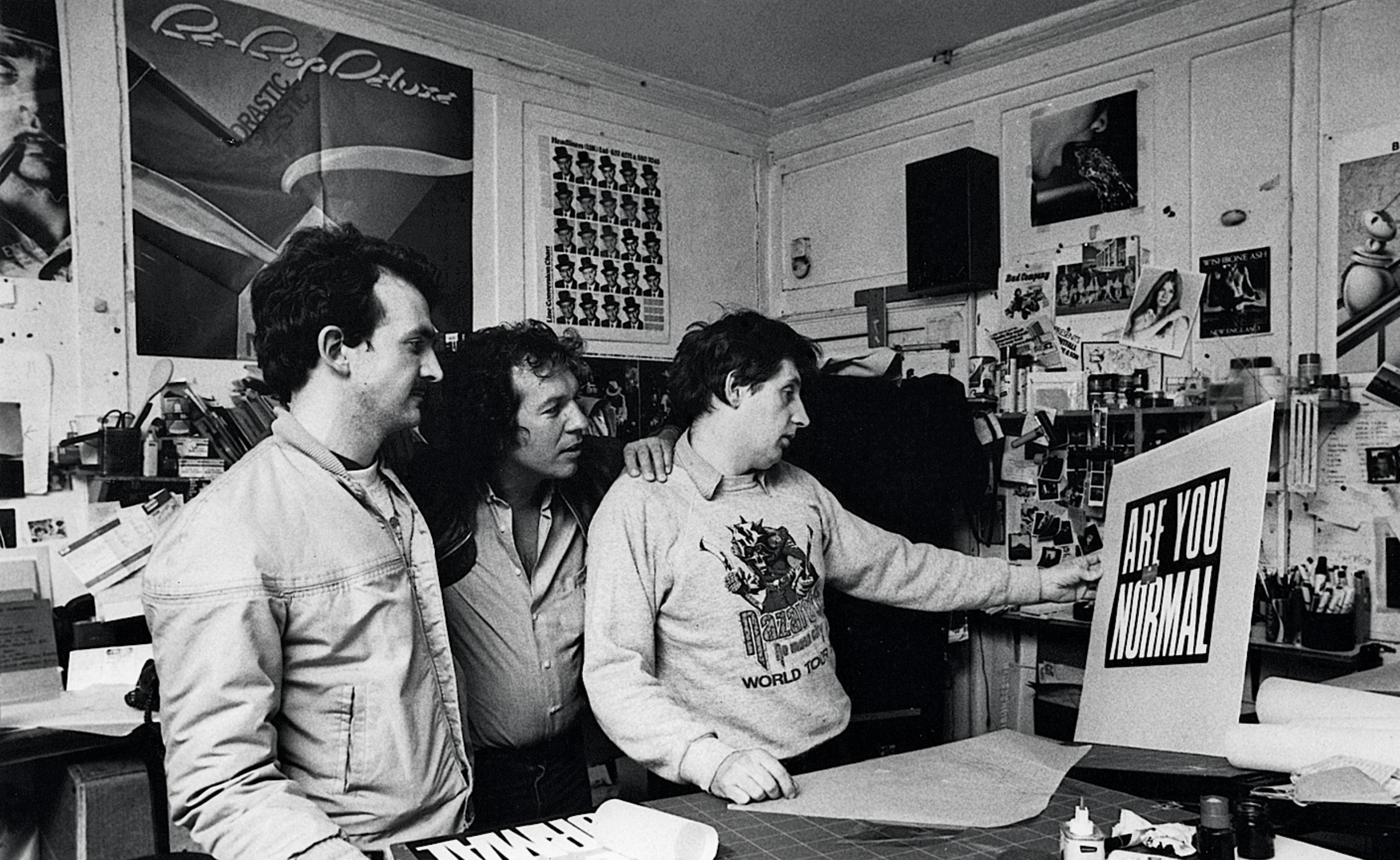 ‘Sleazy’ Peter Christopherson, Aubrey ‘Po’ Powell and Storm Thorgerson, in Hipgnosis’ Denmark St studio, 1979.