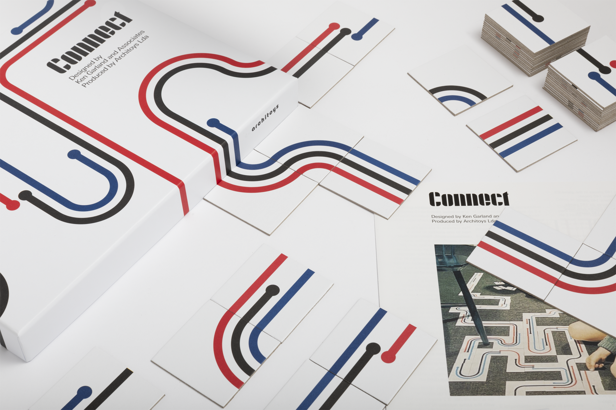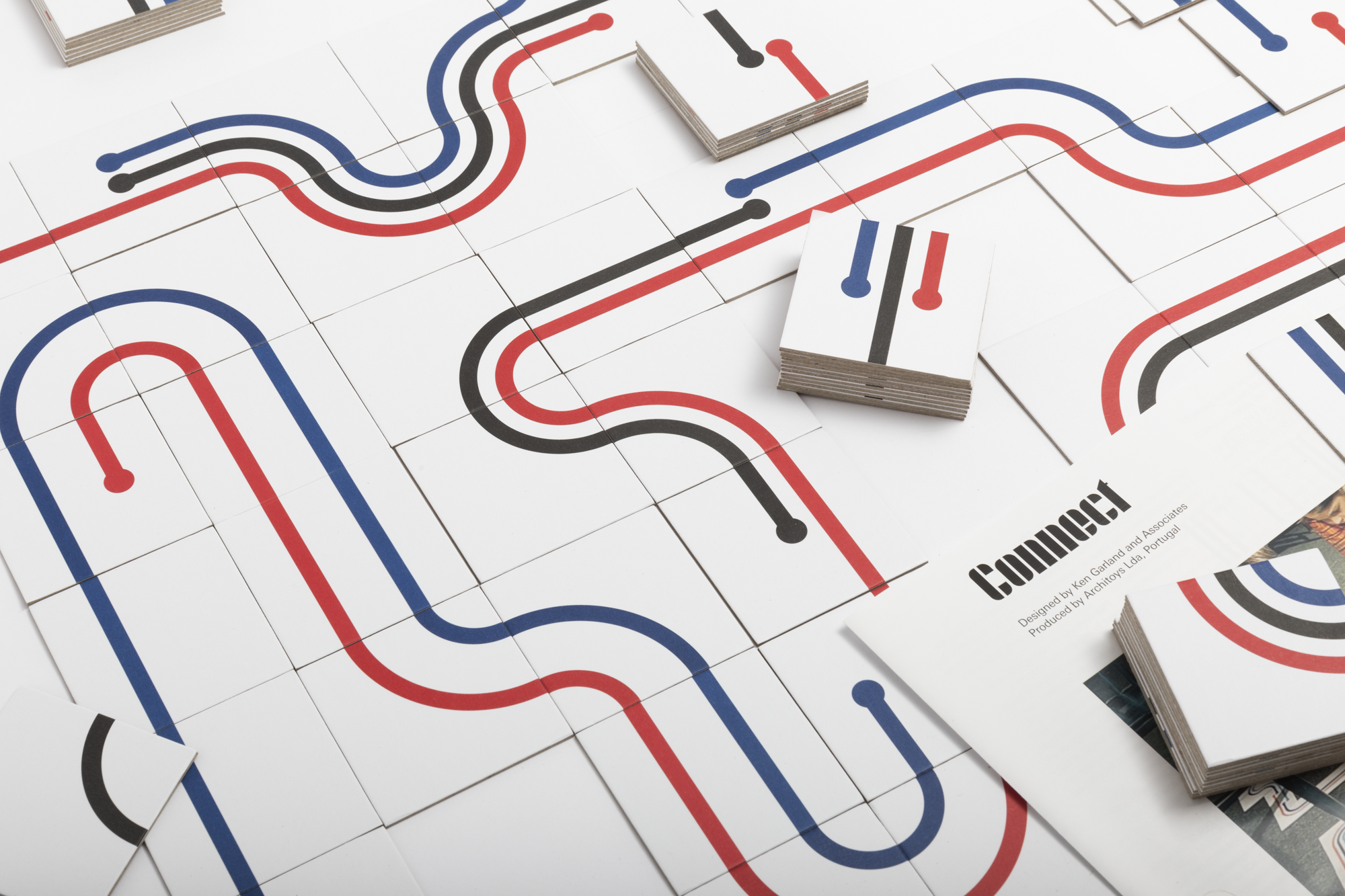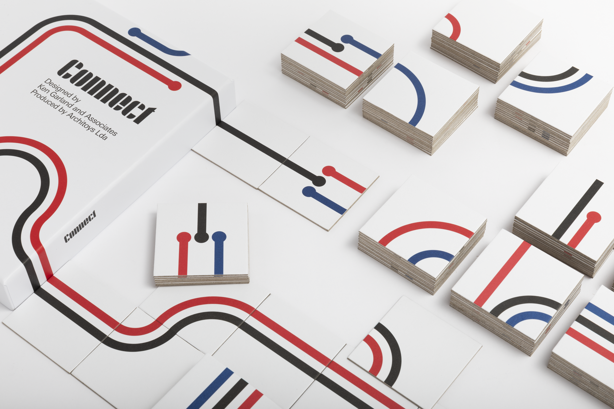 Connect was the most successful game that Garland designed for Galt. Using simple linear structure, colour, and gestalt (pattern recognition), with no pictorial references and related associations, the game is pure graphic design. It consists of 140 cards, each displaying different numbers of straight and curved lines in black, red and blue. The aim of the game, based on the number of lines and the colour sequence, is to connect the cards – a task that can be achieved in all manner of combinations.