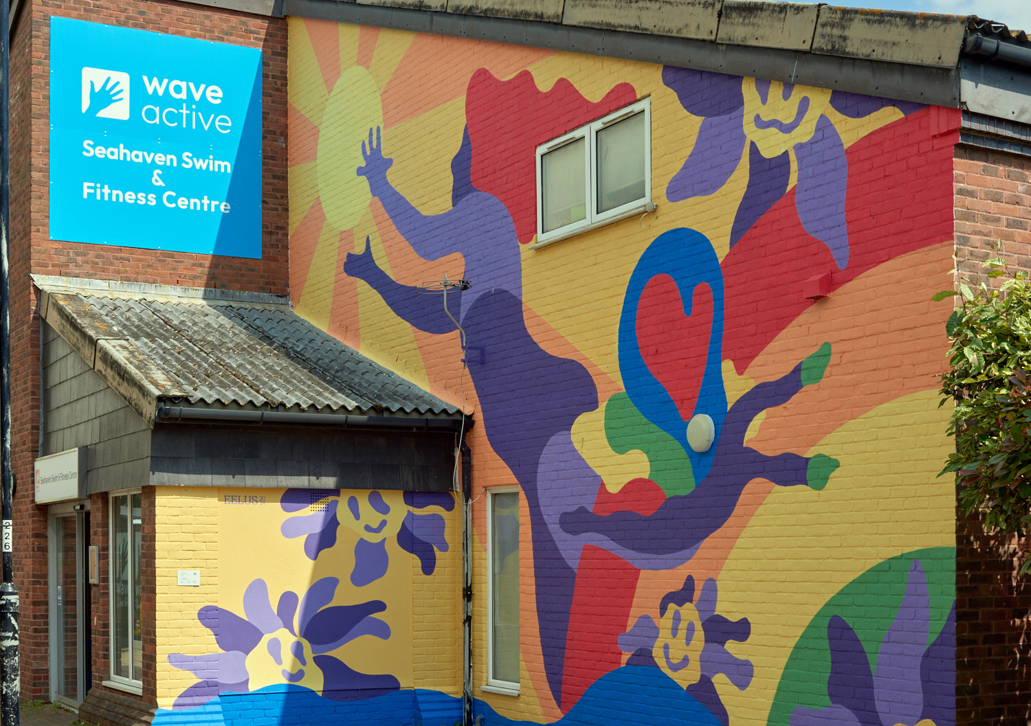 A joy and nature-inspired mural by Lee Eelus on the side of Wave Leisure Trust in Newhaven.