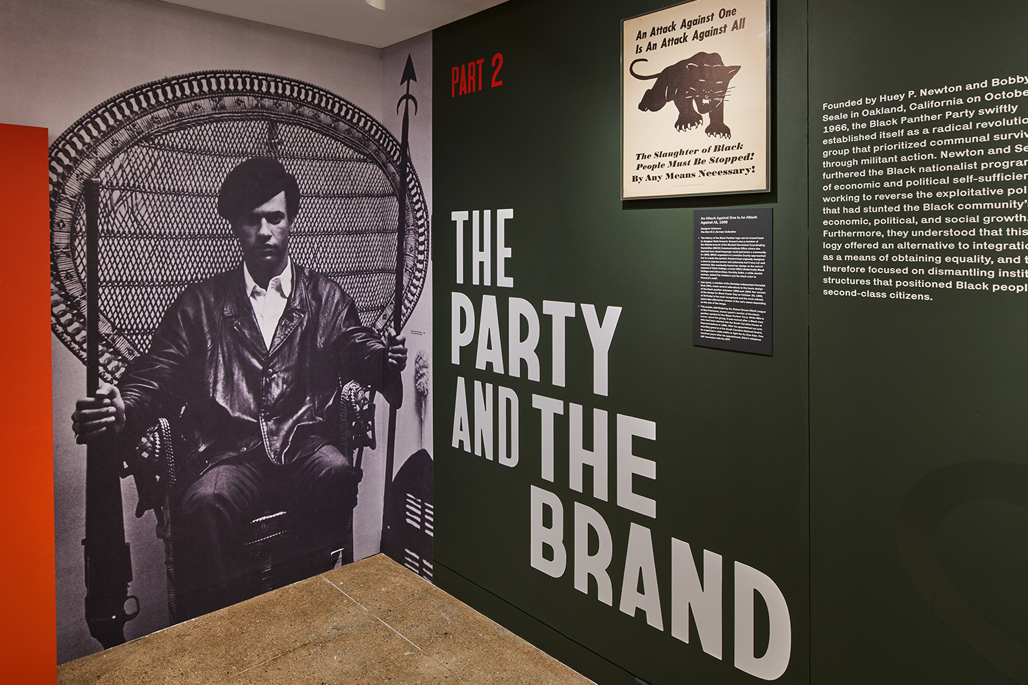 ‘Black Power to Black People: Branding the Black Panther Party’ exhibition. Exhibition design by KASA Collective. Photos by Samuel Morgan Photography. Top. Entrance to the exhibition, featuring photo by Blair Strapp of the Black Panther Party co-founder Huey P. Newton.