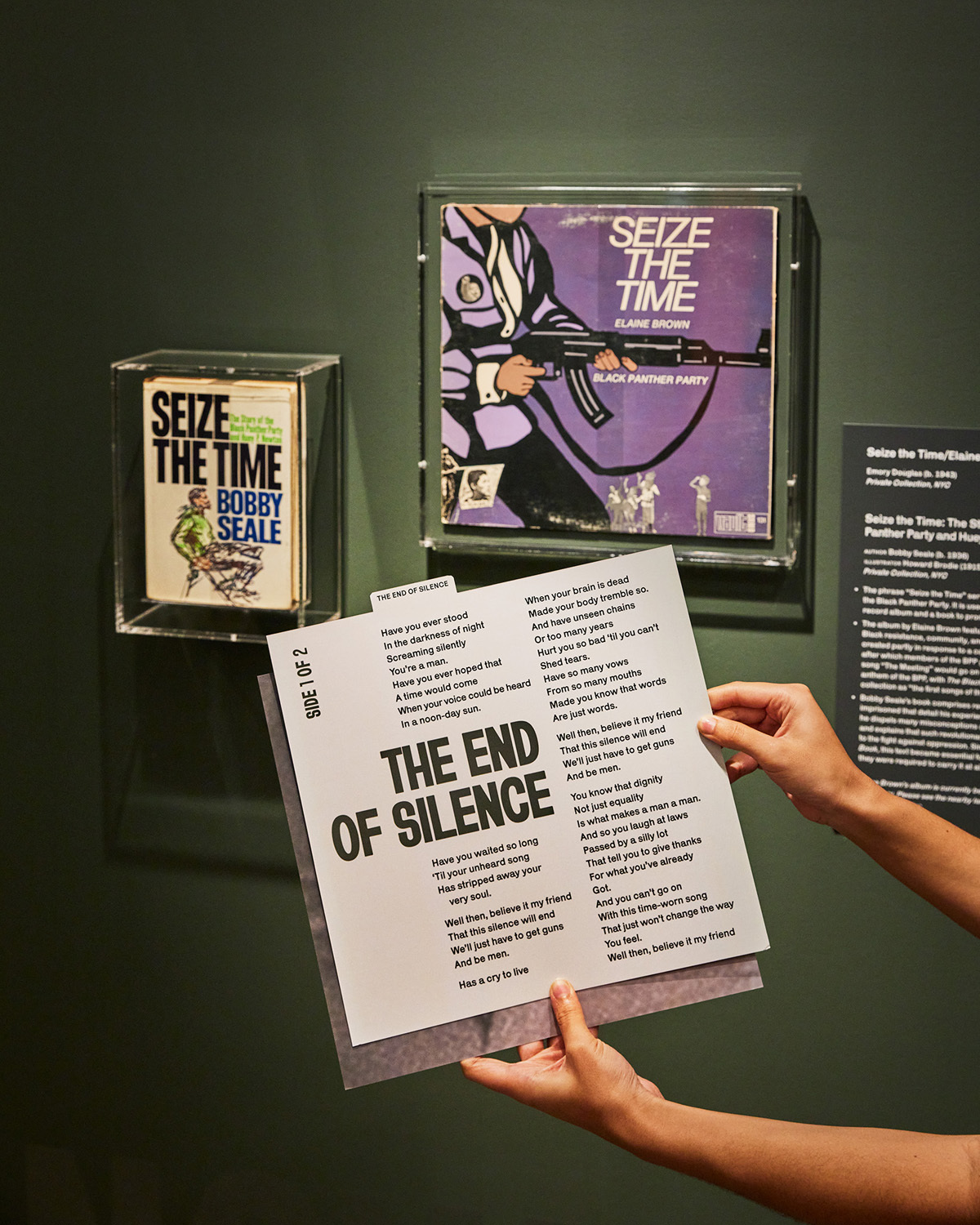The lyrics to the songs played in the background are accessible for audience in print. On display are Seize the Time book by Bobby Seale and Seize the Time LP by Elaine Brown. Photo by Samuel Morgan Photography.
