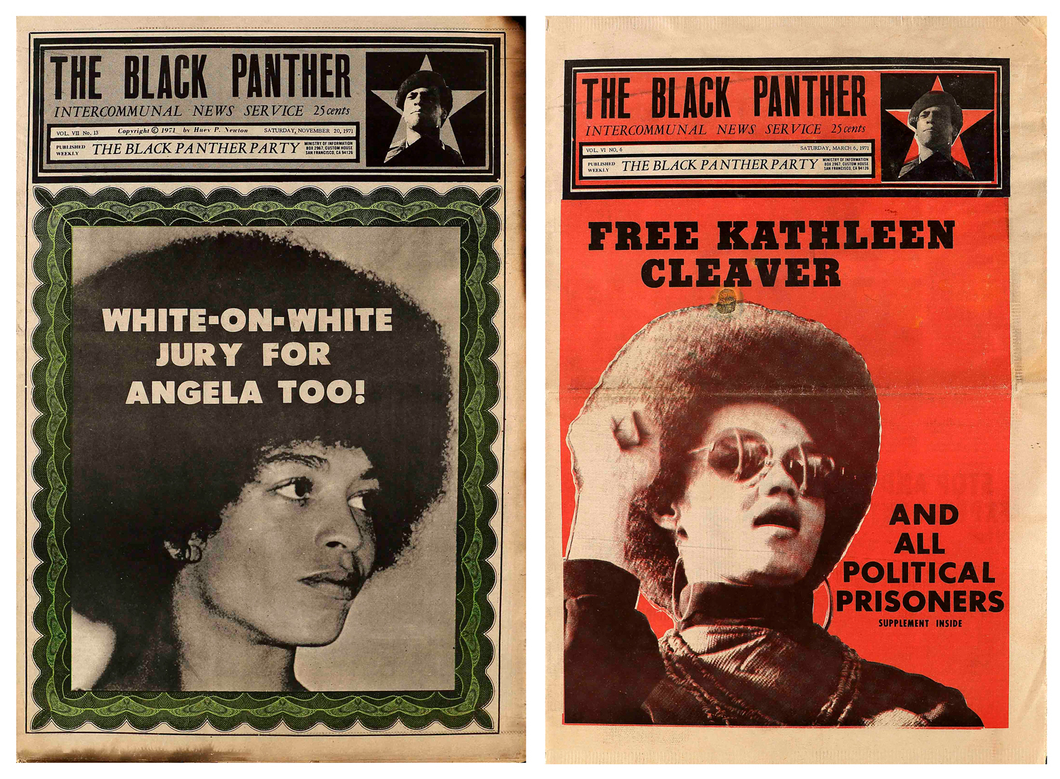 Front covers of The Black Panther papers, featuring activists Angela Davis (left) and Kathleen Cleaver (right).