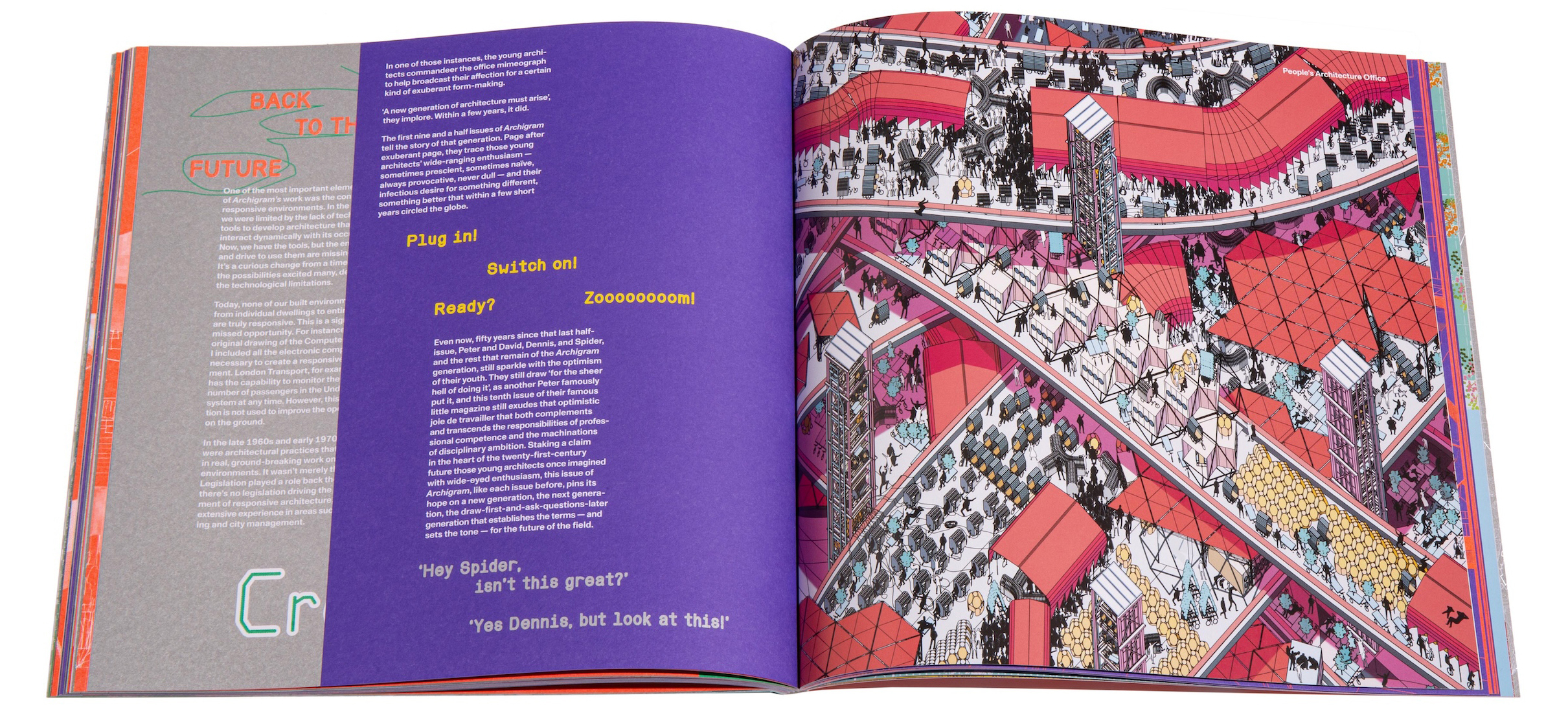 Above: Cover of Archigram Ten, Circa Press, 2024. Right: One of the introductory spreads from the book.