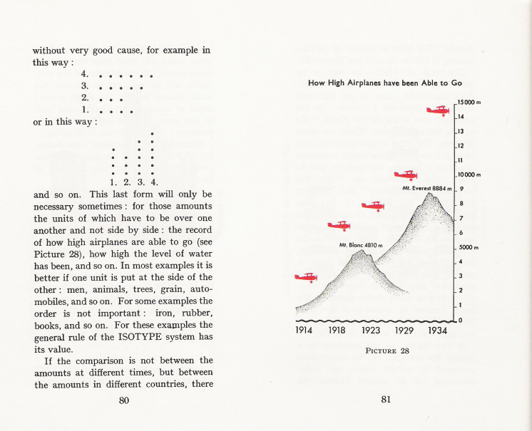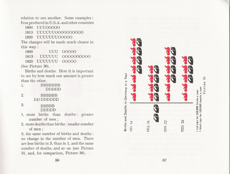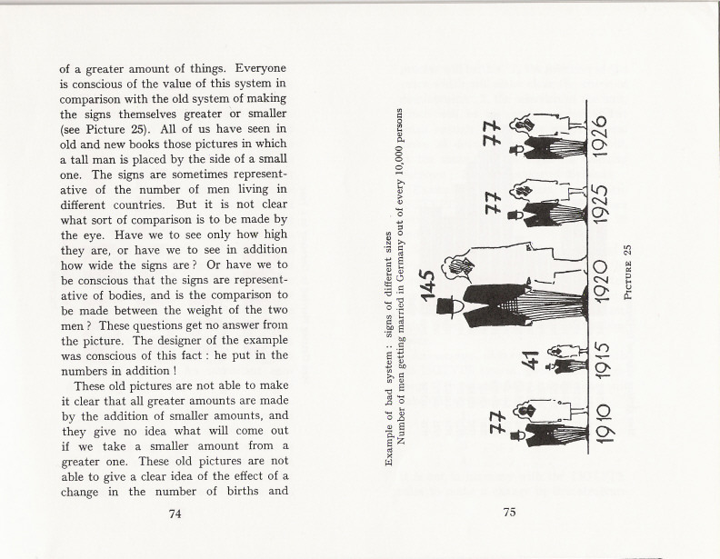What lives on in this book? Working your way through the strange deformations of Basic English and the sometimes touching antiquity of the images, you find things that must be pertinent, still, for any designer. For example: the continuous line of a graph (‘curve’ in Basic English) tells an untruth. We have only isolated data: so show those, as discrete bars. Or, how to order a set of quantities? By size? But then you only see the same story: increase or decrease. Better to find another principle of order: perhaps time or geography. Design a system that will let the material speak for itself. Above all there is the founding idea of Isotype: in representing quantities, repeat a unit, don’t enlarge it. Don’t say more than you know.