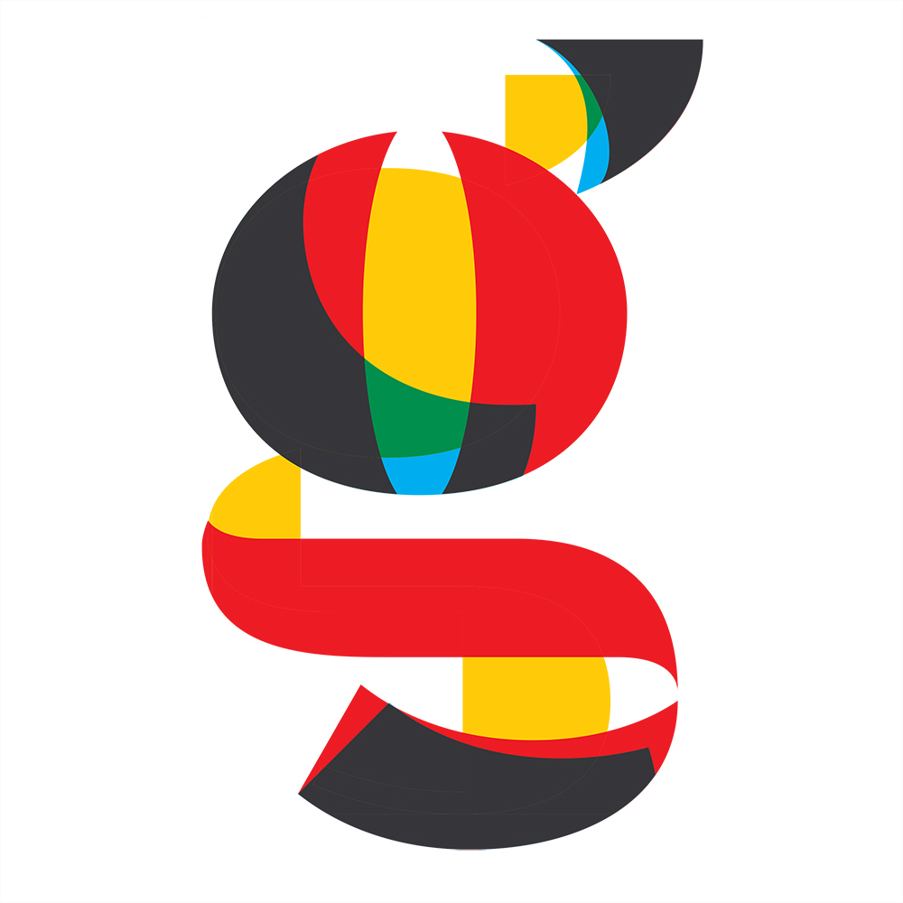 Giant 783pt ‘g’ set in three overlapping fonts of Ziza: Ten (yellow), Seven-Left (blue) and Six-Full (red).