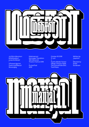 Poster for Manjal, a play in protest of caste and manual scavenging (removal of human waste by hand). It was performed at Purisai Festival in 2019 by the revolutionary theatre group Kattiyakkari. The title is shown rendered in Tamil and Latin scripts.