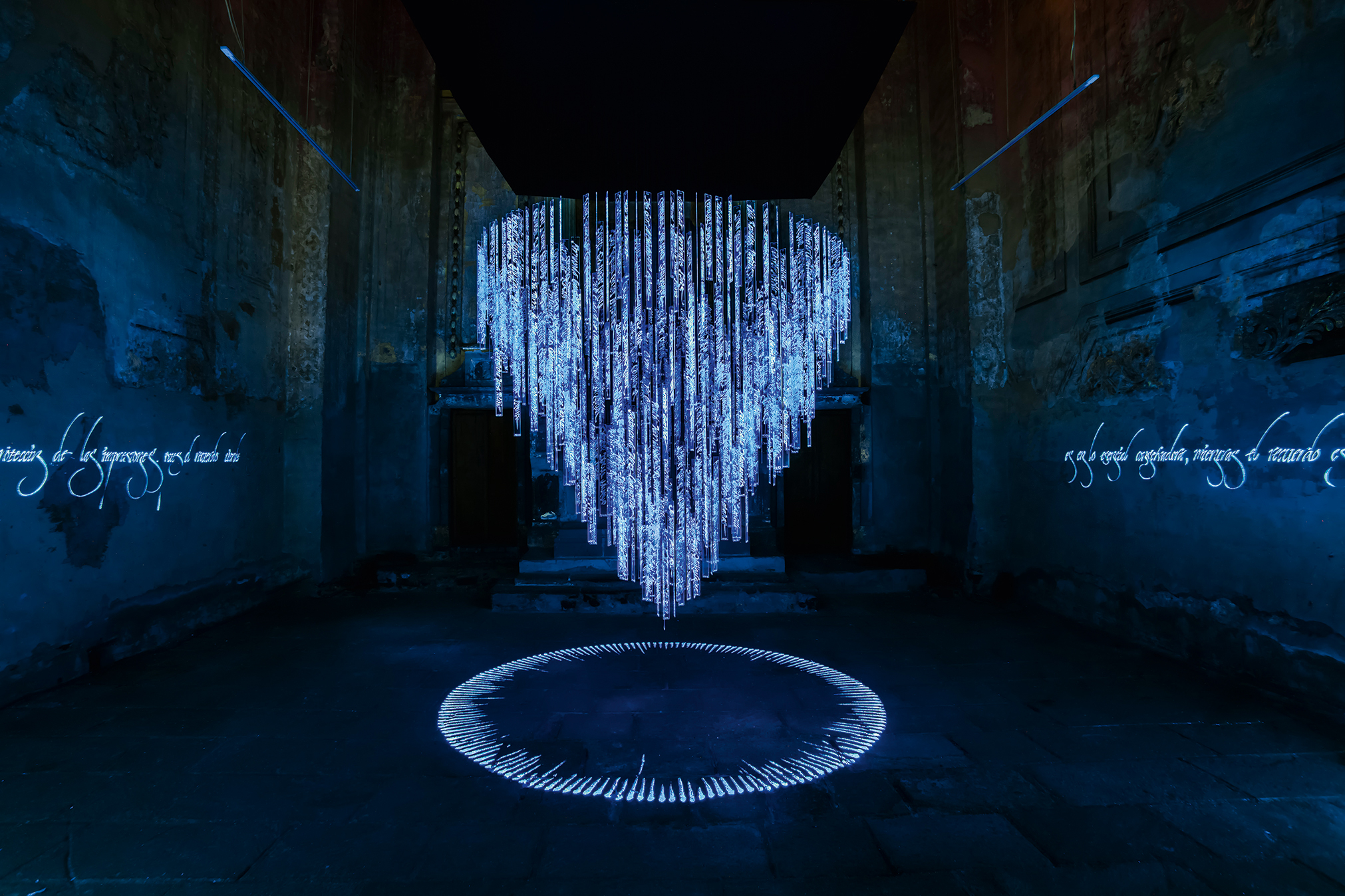 Apariciones, 2012-13, an installation by Said Dokins comprising 580 acrylic plates inscribed with the names of the political disappeared in Mexico from 1972 to 1998 – the inscriptions appear and disappear, depending on the intensity of the ultraviolet rays.