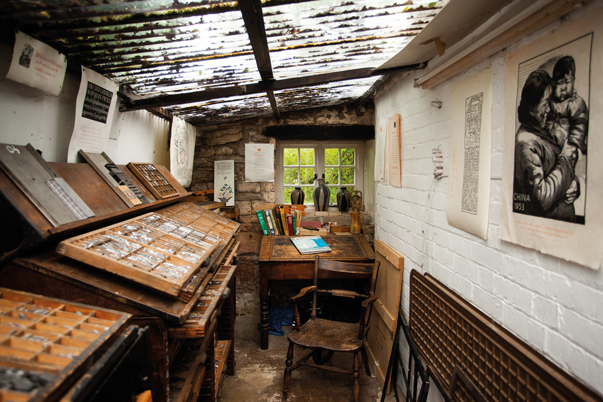 Inside the single-storey Press building, a cottage in the grounds of Whittington Court, metal type is in cases ready for handsetting.