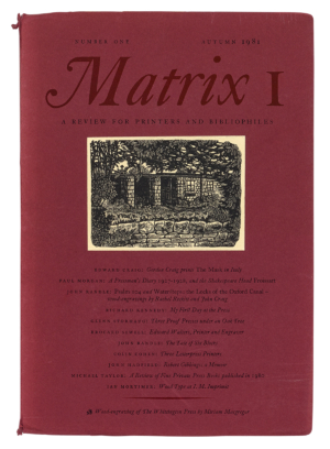 Front cover of Matrix 1. Autumn 1981. Print run: 350 copies. The cover is printed letterpress on tinted paper, while the wood engraving of the Whittington Press buildings by Miriam Macgregor is printed on cream paper and tipped on. Page size: 200 × 290mm. Inside Matrix, the letterpress text and images are printed on Heritage Laid and Zerkall Halbmatt papers.
