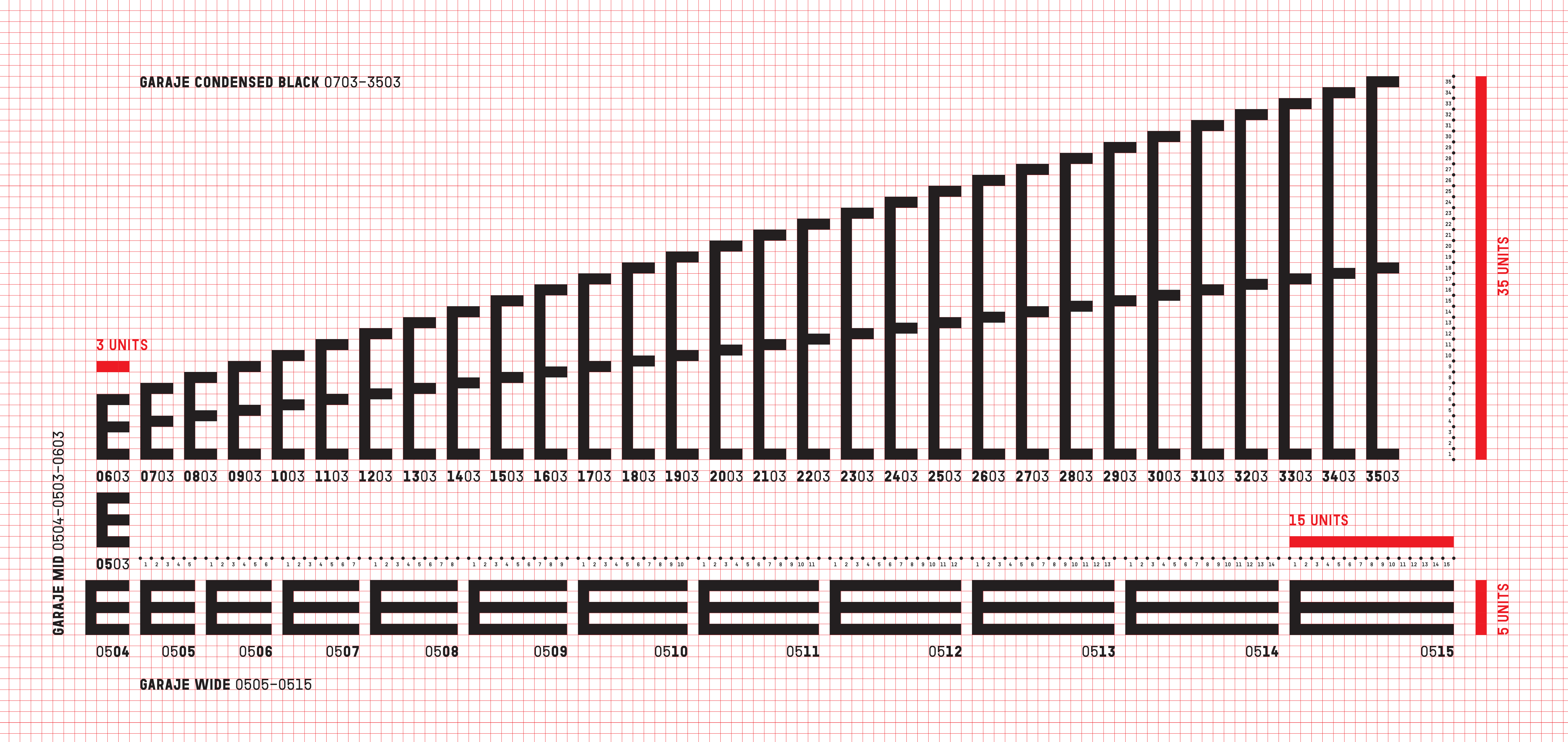 Garaje Condensed Black, in a specimen that shows different widths with the same stroke weight. Garaje is a complete system, available in 44 widths and five weights, permitting users to compose in many sizes without changing the stem weight.