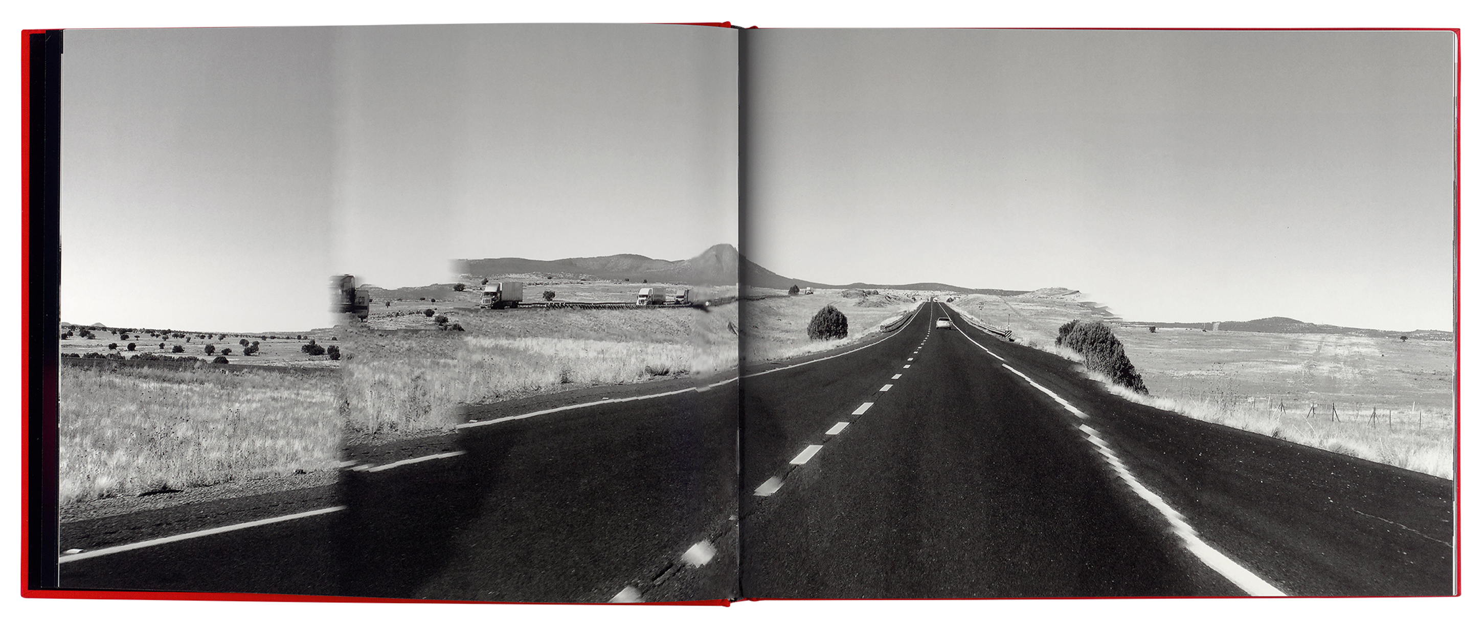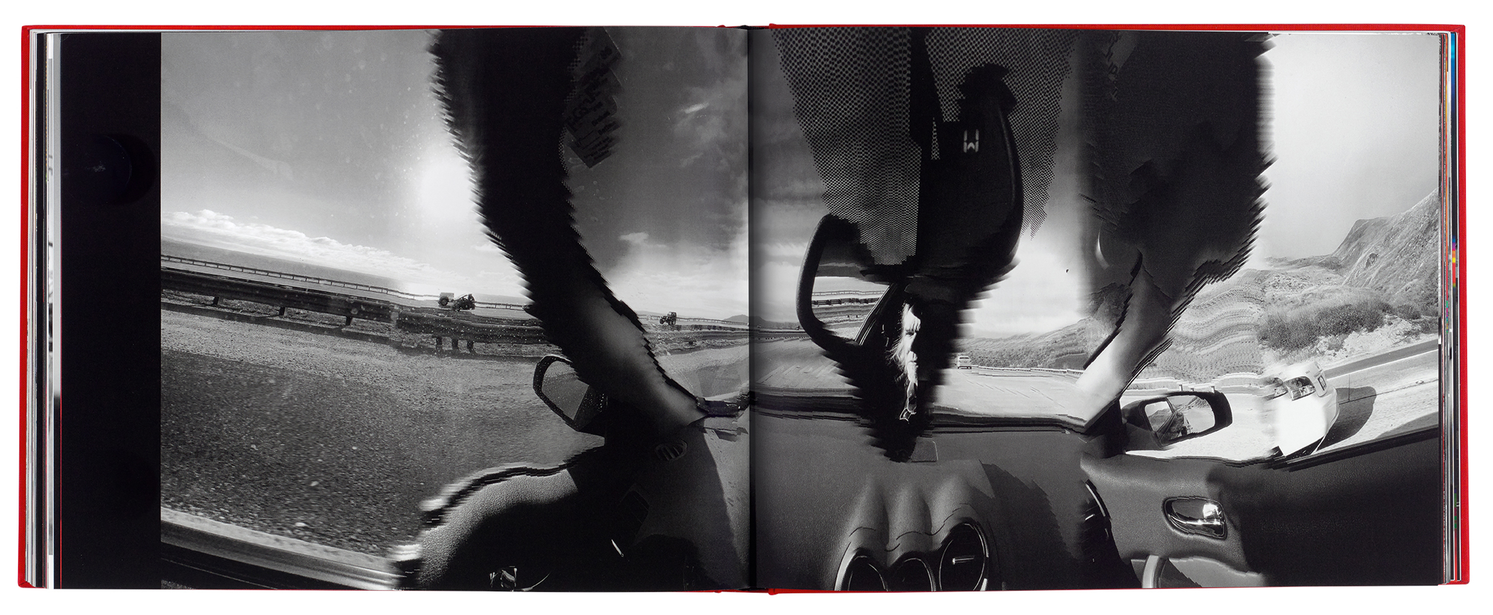 Sylvian was fascinated by the glitches and errors that occurred as the iPhone’s technology attempted to keep up with the speed of his car. Back in his lodgings each evening, he edited his iPhone images, removing most of the colour, but occasionally leaving a trace of red that echoed the car’s interior. Towards the end of his middle-American odyssey, the effects of the global pandemic began to make themselves known. Sylvian reflects upon the intimations of mortality brought by the sight of a, ‘multi vehicle pile-up … a car burst into flames … brutalized SUVs, trucks and fragments of vehicles being pulled from the road.’ He muses that the occupant of a comfortable, air-conditioned car interior is ‘frequently the length of one, possibly two cars from oblivion’.