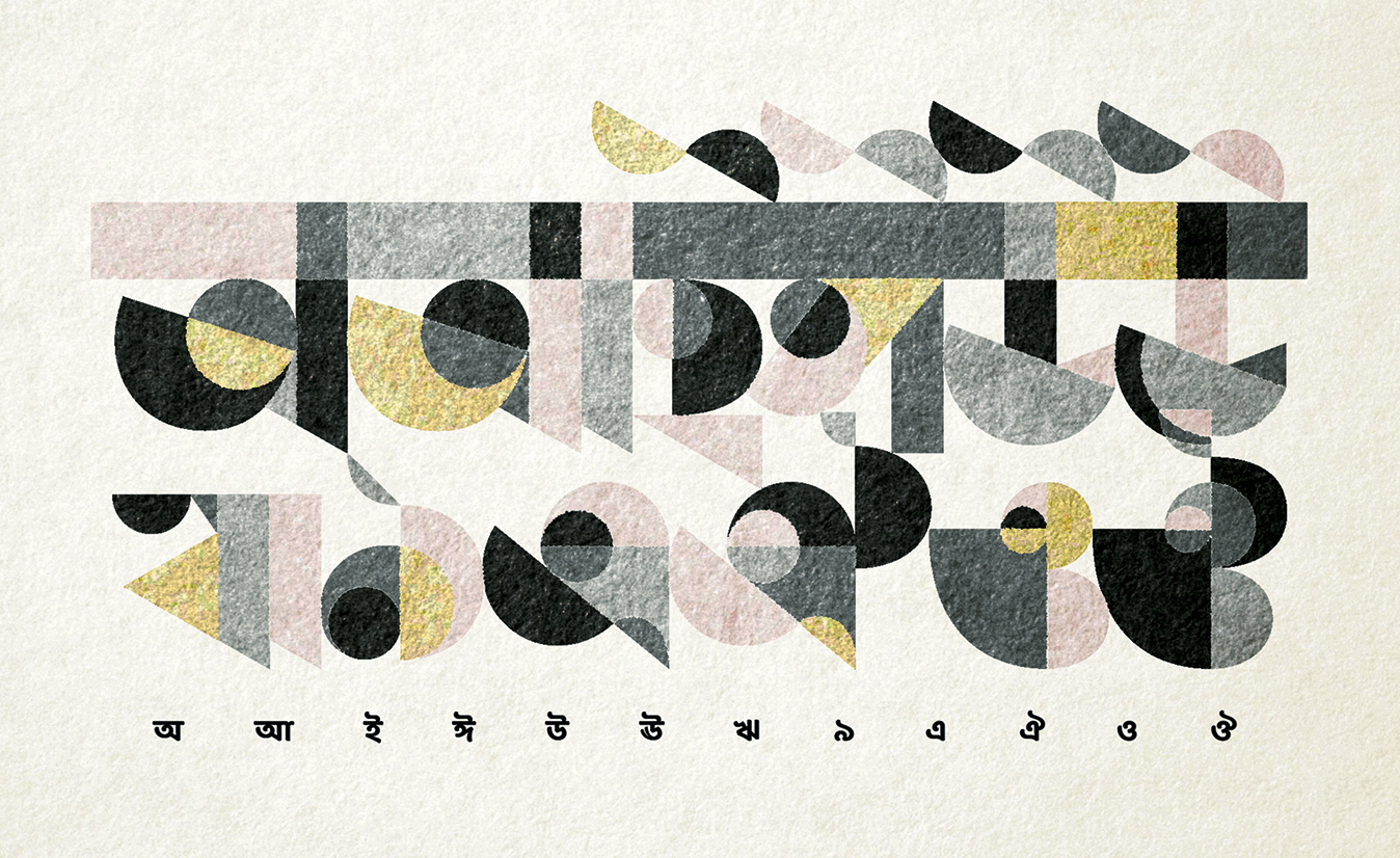 From Sulekha Rajkumar’s ‘Aakar Prakar’ series of Bengali lettering experiments that explore the materiality of tools (2020-21). Top. The complex forms of Bengali vowels are simplified and redesigned via basic geometric shapes and ‘odd proportions’ by Sulekha Rajkumar (2017).
