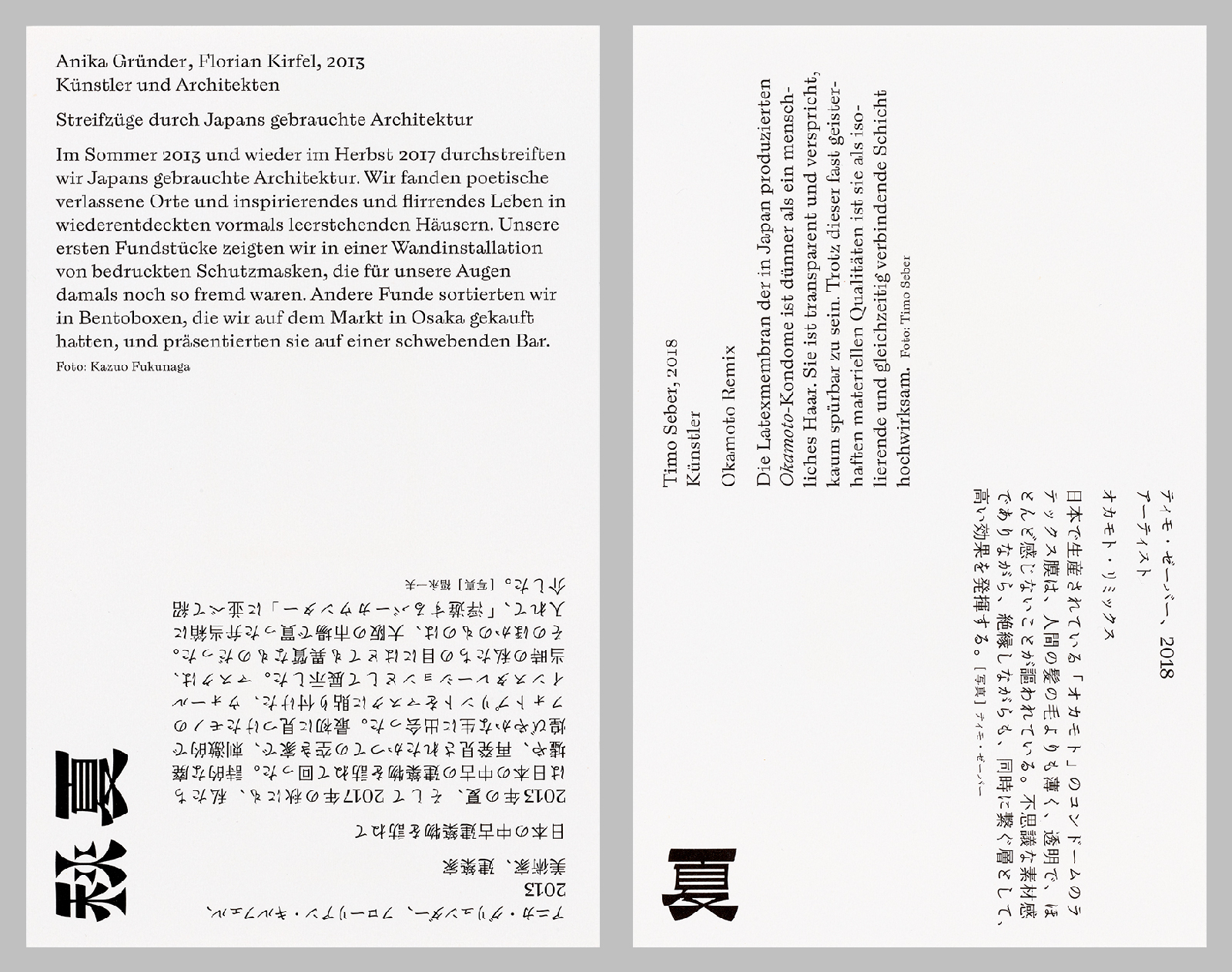 Ulrich and Izumo have been friends since they were students together at Berlin University of the Arts, but this is their first project together since graduation, ‘many years ago’. The Goethe Institute gave them a free hand, specifying just the need for a container that could be shipped in an XS-sized parcel. Their approach resulted in a series of typographic card backs on which the Japanese text set in MaruminKatura spars with the German set in Laica. Big bold Ribaasu kanji characters for the seasons – spring, summer, autumn and winter – announce the different cohorts to which the resident artists belonged while at Villa Kamogawa.