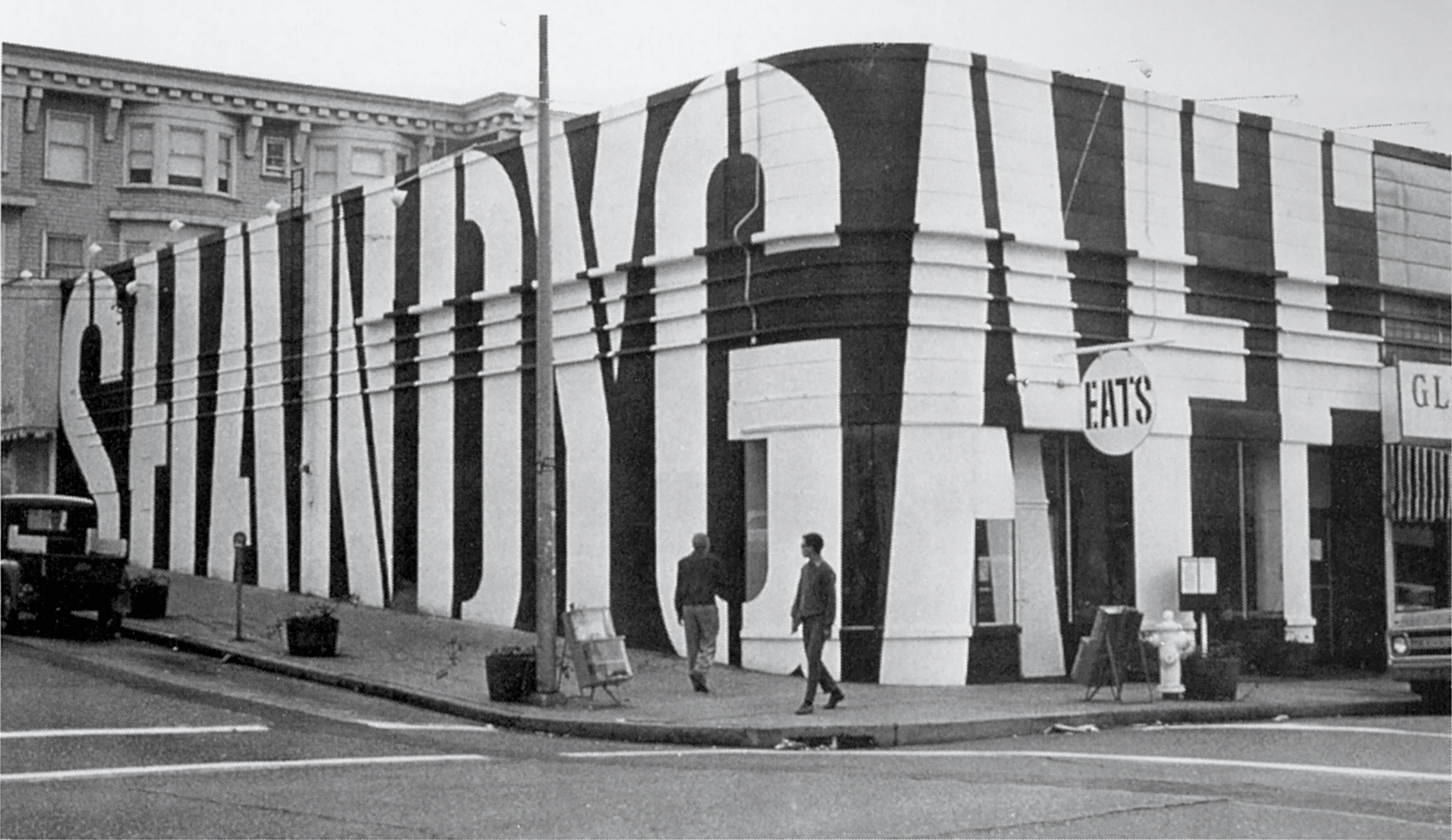 ShandyGaff ‘healthy food’ hot spot in San Francisco with supergraphics by Marget Larsen, 1971.