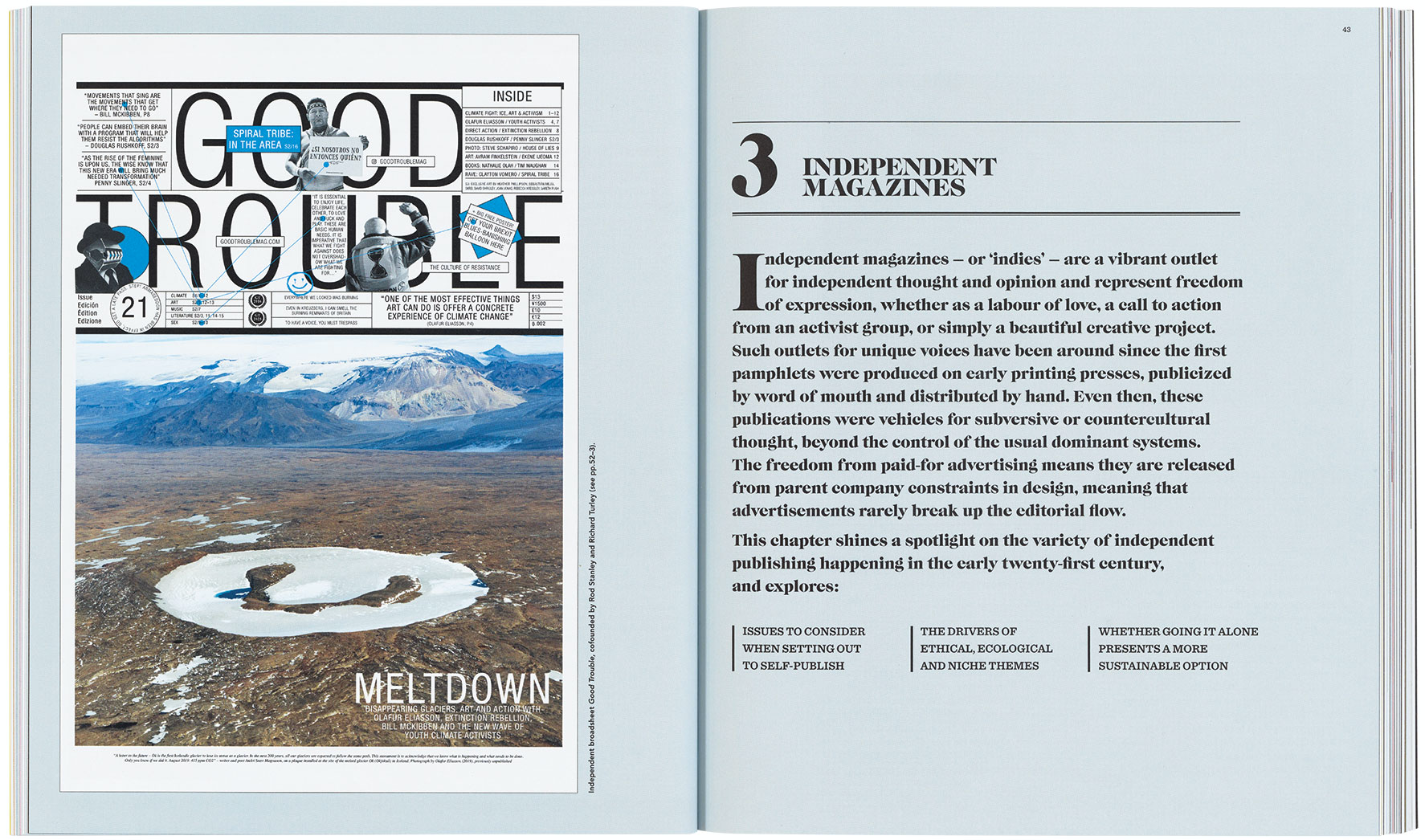 The book’s running text is paralleled by a rich selection of covers and spreads with detailed captions and insightful interviews with leading figures in publishing. Among them are creative director Gail Bichler of The New York Times Magazine (above, see Eye 96), Richard Turley (above, see Eye 100) and Pentagram’s Matt Willey.