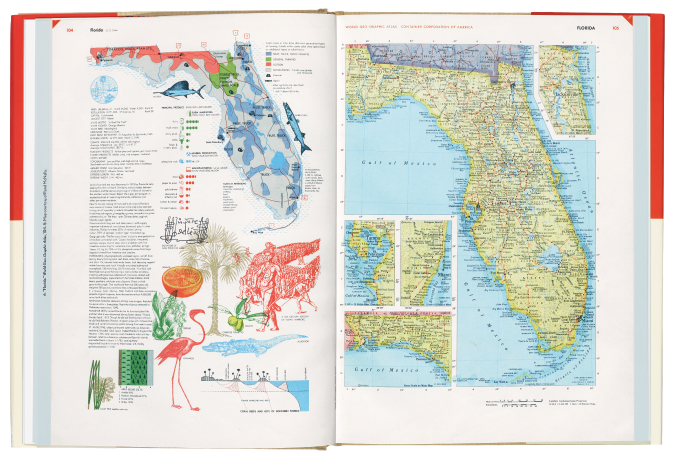 Far more people have heard of Herbert Bayer’s World Geo-Graphic Atlas than have encountered the hefty 40 × 29cm, 350-plus page book itself. This is because it was privately published in 1953 by Container Corporation of America (CCA) to be given as a corporate gift to its customers and friends (see ‘Big business, big world’ in Eye 82). Anyone who has had the opportunity to flip through the double-page spreads cannot help but recognise a masterpiece of graphic design. The experience of absorbing the graphics and text Bayer assembled is a tour through the highlights of Modernist information design. The book presents astronomy, geology and meteorology (among other sciences), as well as global natural resources, transportation and economics (among other topics), before descending into the sequence of maps we usually associate with an atlas. Even in this conventional part, maps of each state and country are punctuated with individual collages of images and economic data. Bayer manages to integrate complex combinations of maps, illustrations and data visualisation into a page flow of balanced white space, colour contrasts and typographic clarity.