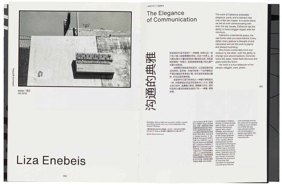 Other outdoor installations, which function as openhanded ‘public design’ more than ‘public art’, are shown in the gallery and book in a way that demonstrates the scale of Griffiths’ projects while keeping the attention warm and personal. Friends and colleagues such as Liza Enebeis (see Eye 100), Masayoshi Kodaira (Japan), Anastasia Genkina (Russia) and Scarlett Xin Meng (China) contribute further short essays. The design, by Griffiths and Bruce Connew, incorporates texts in Chinese and English.