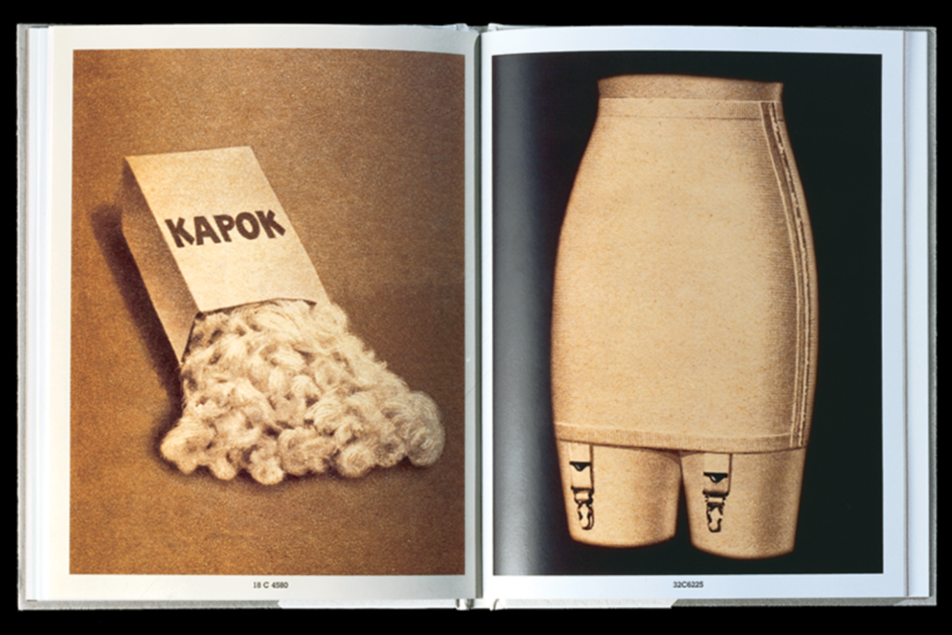 Each object occupies a single page and is given equal weight and scale. The images are sequenced according to simple relations between shapes, and though it is book-ended by dresses, the sequence does not progress or lead in a single direction. Against the grainy backgrounds reproduced from the catalogue, these unmanipulated objects assume solid, sculptural forms; viewers can contemplate their curves, folds, and peculiar expressions, imagining their wearers, users and makers. But Goldberg breaks the contemplative spell by inserting catalogue numbers just below the objects, lest more poetically inclined viewers fly too far into the ether. After all, they are just consumer goods, fabric and wood like anything else. It’s on the page, encased in Goldberg’s faithful palette of greens, greys and browns, that they come alive.