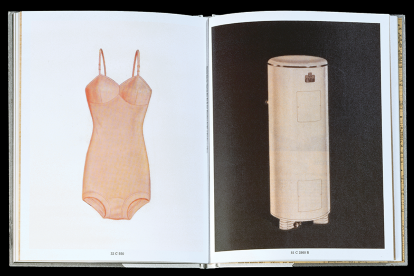 Catalog is assembled from a winter 1951-52 consumer goods catalogue. Goldberg chose intriguing images of bygone everyday products – a wig, a girdle, and a toy man, for example.